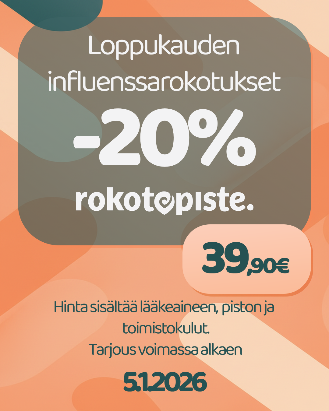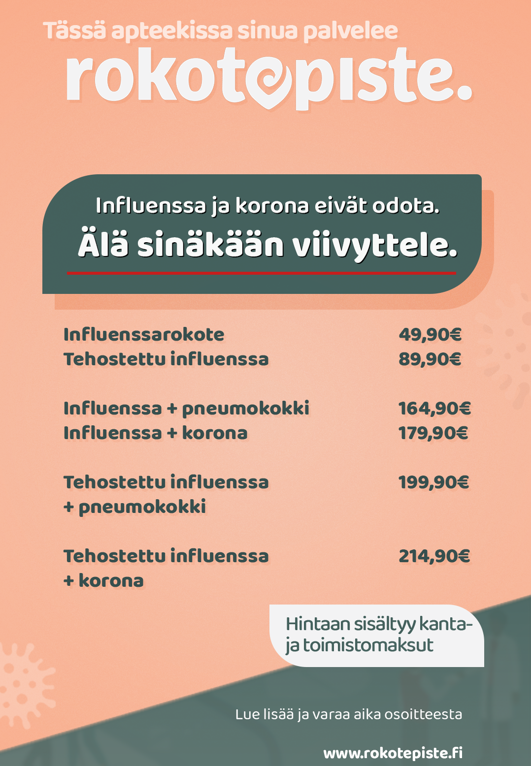 Meiltä saat ajankohtaiset rokotukset farmaseutin pistämänä. Lue lisää ja varaa aika osoitteesta www.rokotepiste.fi tai soita apteekille! Asiakastilanteen salliessa rokotamme myös ilman erillistä ajanvarausta.