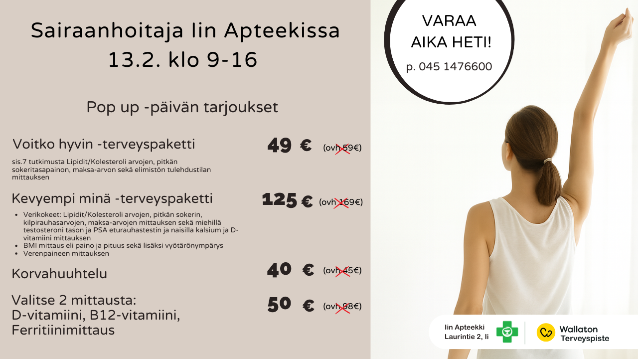 Meiltä Iin apteekilta ja Yli-Iin sivuapteekilta saat rokotukset helposti ilman erillistä reseptiä. Rokotamme vain yli 18-vuotiaita. Voit varata ajan soittamalla tai osoitteesta www.rokotepiste.fi.